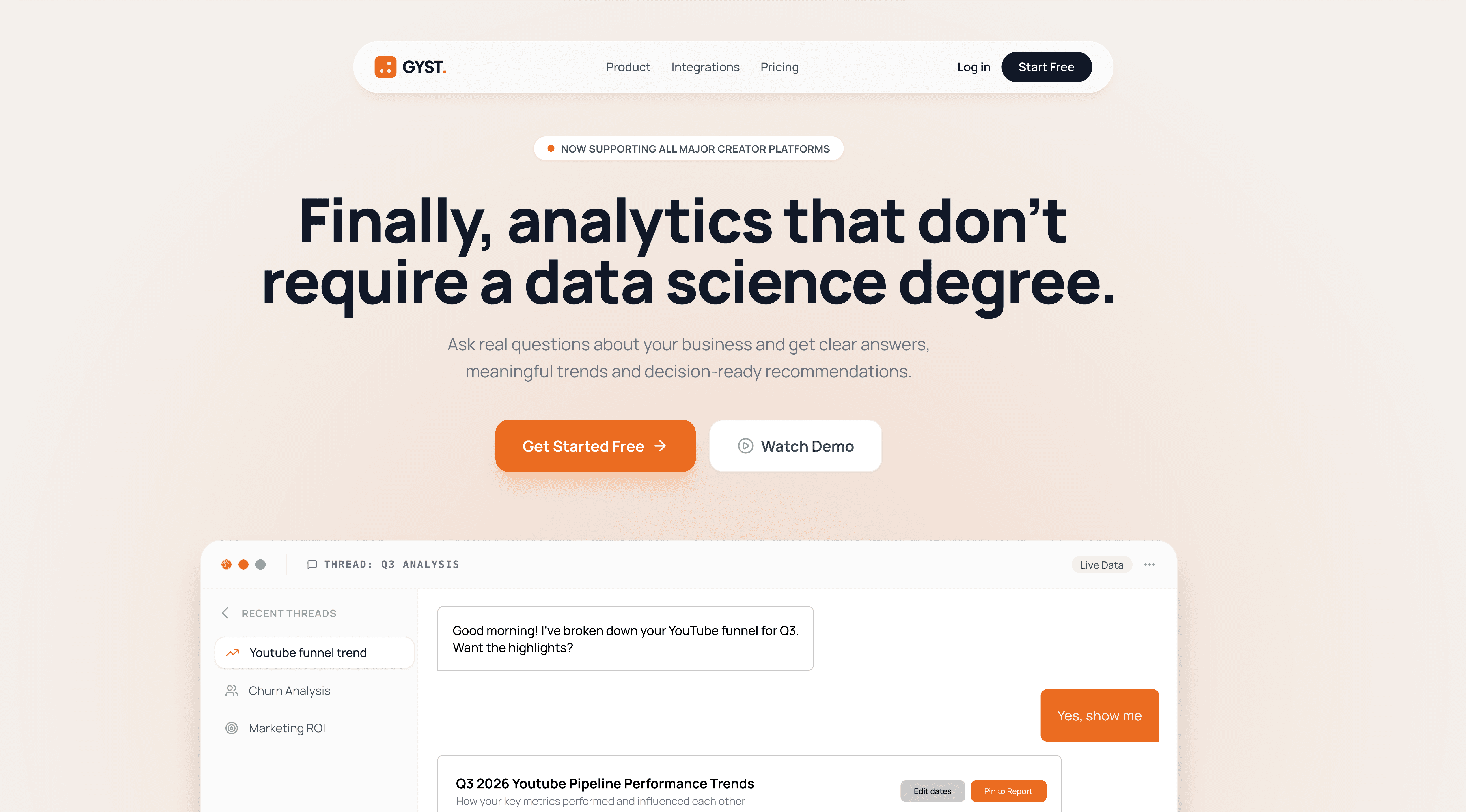 GYST is a creator-first insights platform that pulls together revenue, brand deals, affiliate data and platform performance in one place. Their users are small, fast-moving teams without analysts. They don’t need more data and charts. They need answers.